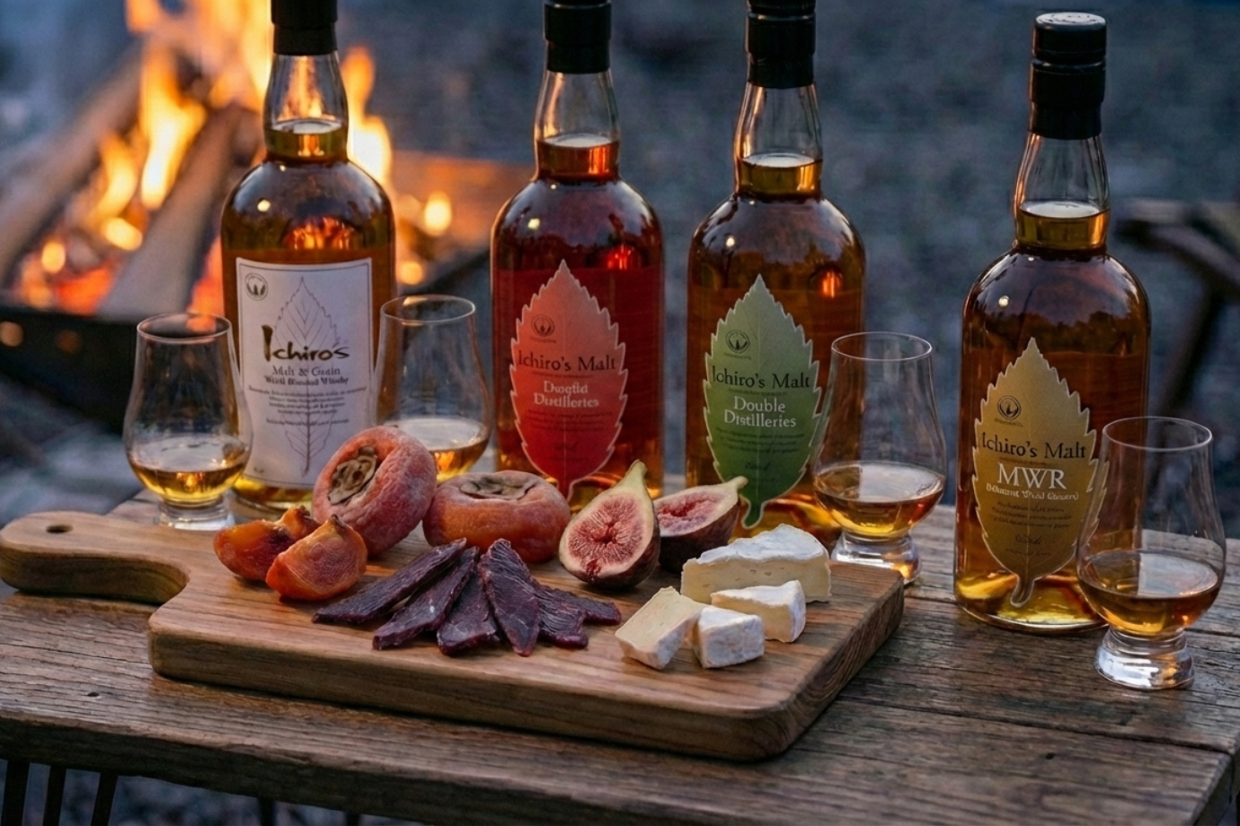 ・ウイスキーとのペアリングテイスティング:焚き火の香り体験とあわせて、ウイスキー(イチローズモルト)をハーフサイズで飲み比べ。香りと味わいの変化を体感していただきます。